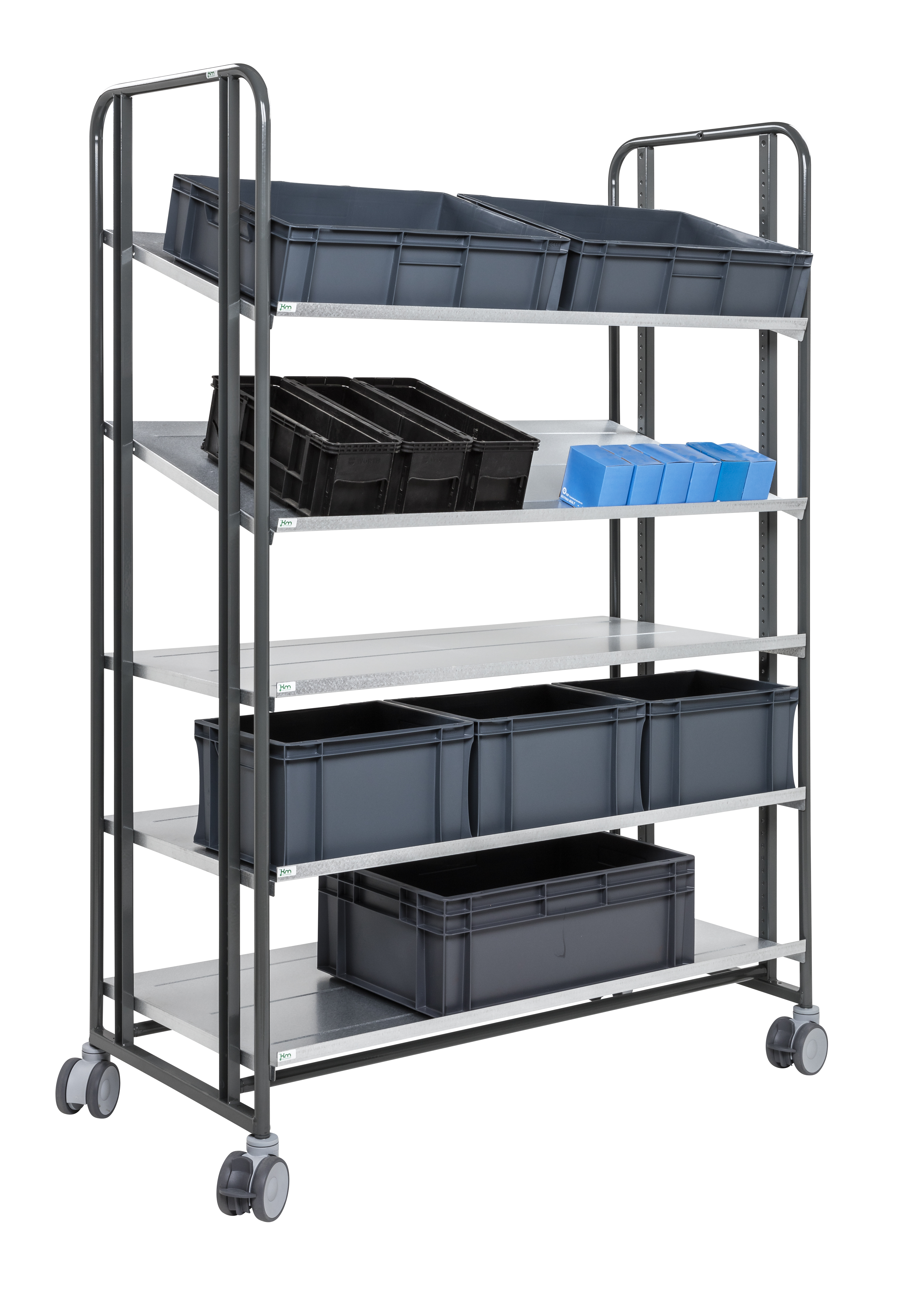 Verniciato a polvere. Ripiani regolabili. Dimensione interna: 1220 x 540 x 1660 mm. 5 ripiani. Capacità ripiani: 50 kg. Ruote: 4 girevoli 2 con freno. Diametro ruote: 100 mm.