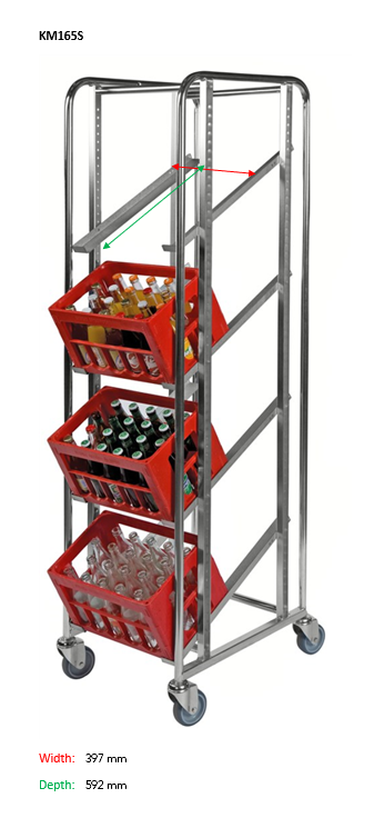 Carrello porta contenitore con freni regolabile per 4 cassette acqua/birra svedese. I binari possono essere montati verticalmente o inclinati.