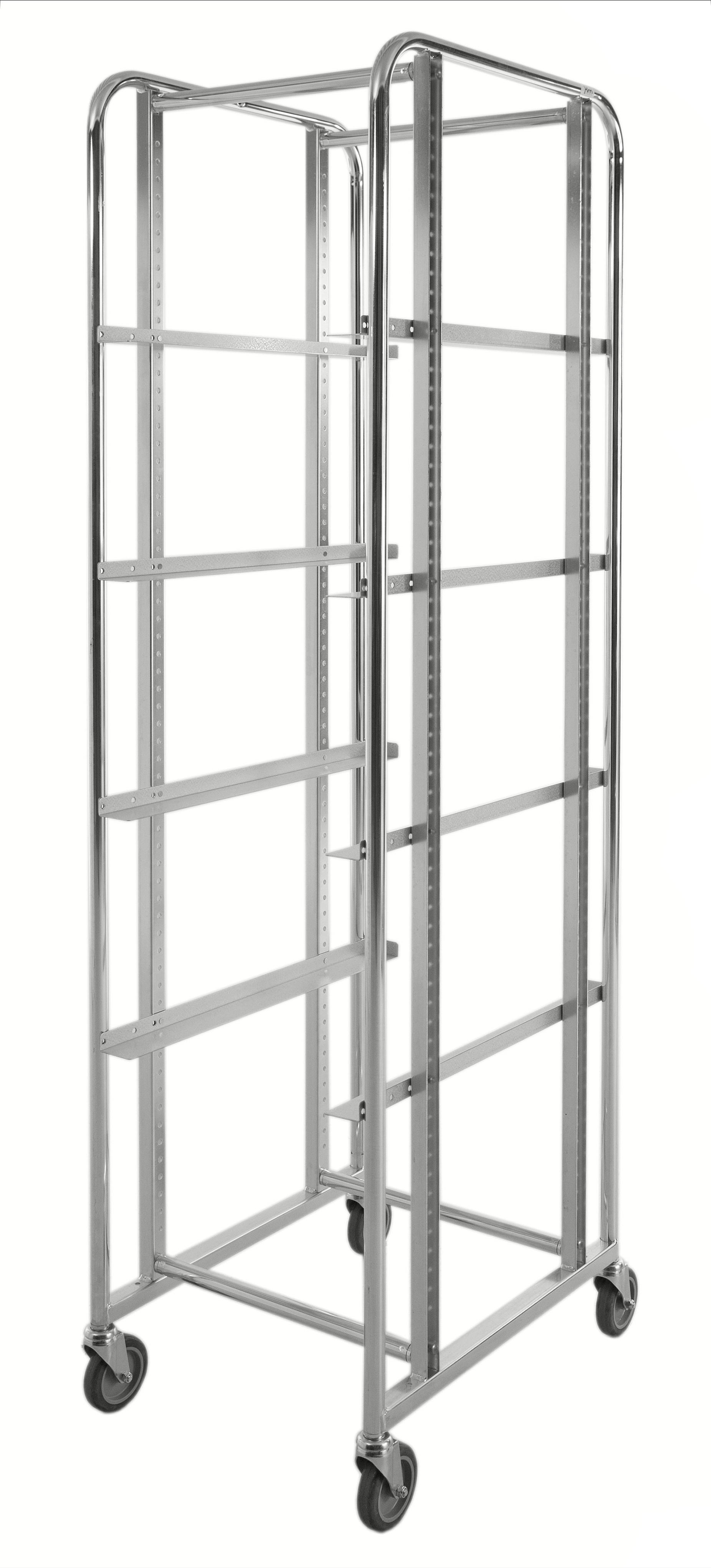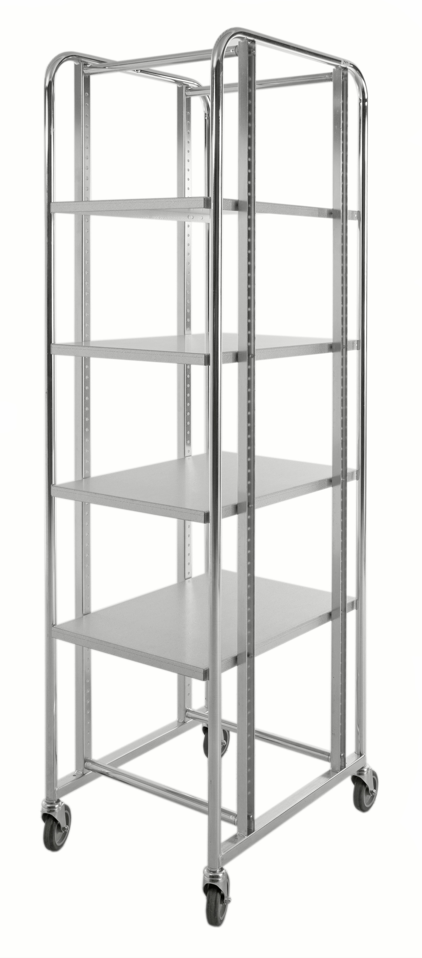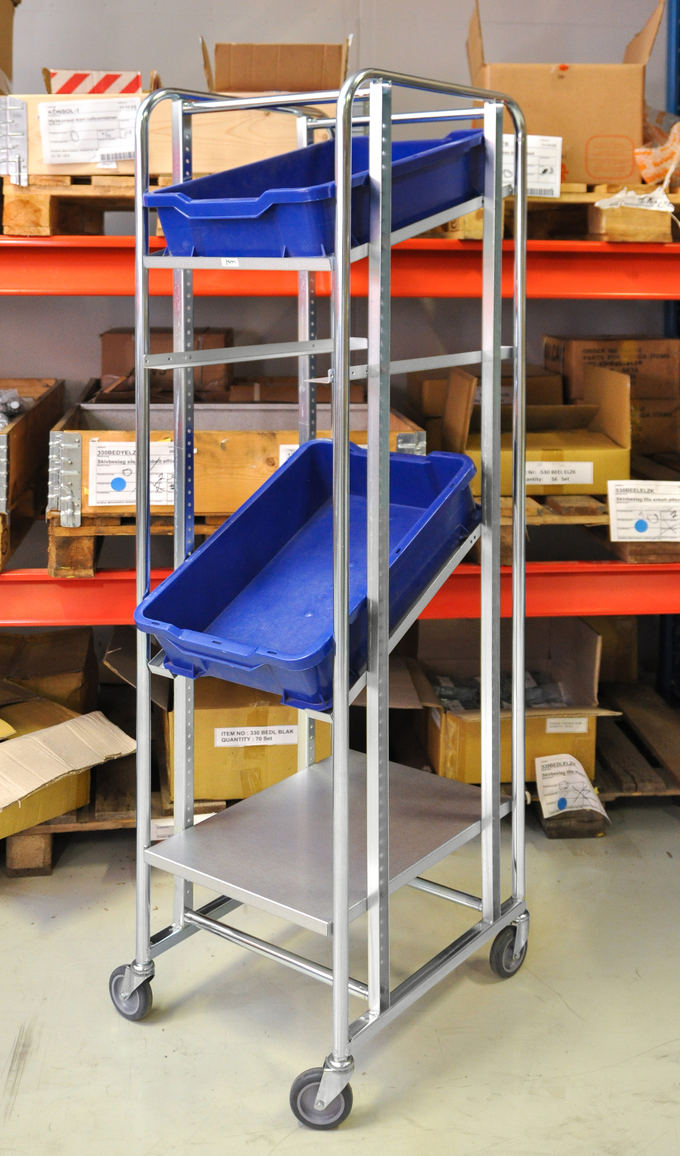 Elettro galvanizzato acciaio tubolare da 25 mm Senza ripiani e binari Per contenitori di plastica 600 x 400 mm È possibile montare i binari / i ripiani orizzontalmente 16°, 30° e 40° Numero di fori 105, cc:15 mm4 ruote girevoli 100 mm Capacità 150 kg