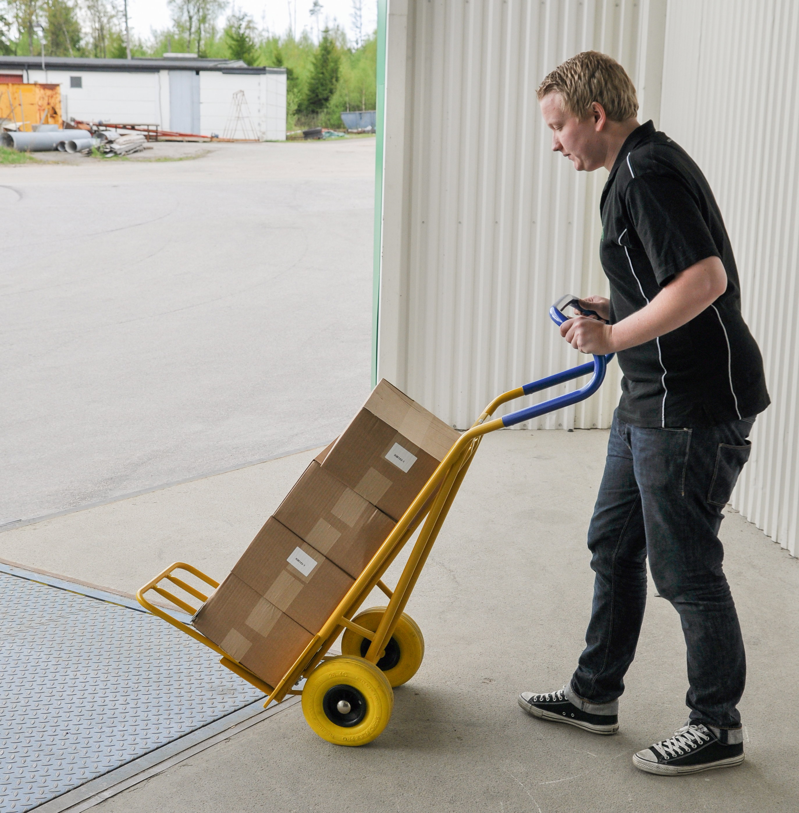 Carrello classico robusto con ruote pneumatiche 260 mm. Impugnatura ergonomica e piano di carico pieghevole.